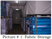 Fabrics are kept off the floor and on the palettes and according to dye-lots to avoid mixing up. The uncovered/unprotected rolls are also covered with cloth. See pic # 1.
